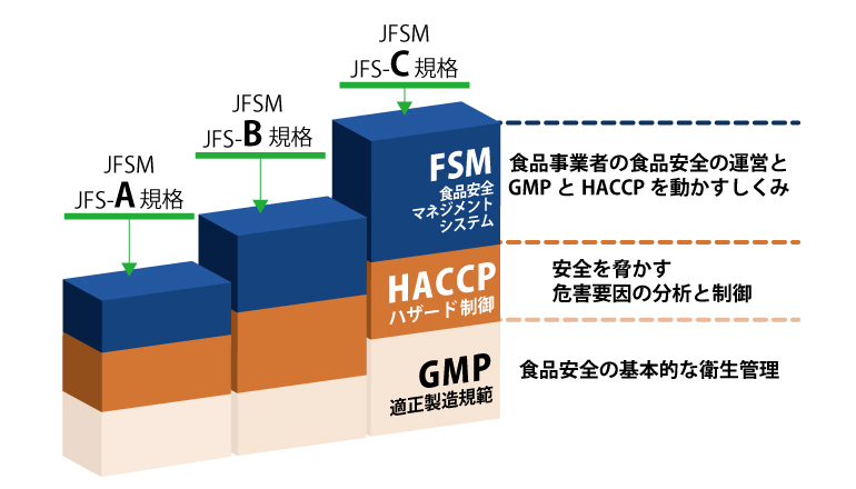 JFS-B規格は、食品安全に対する国際的な認識と整合を図るため、GFSI(世界食品安全イニシアティブ)の提唱するグローバル・マーケット・プログラム(中小規模事業者向け食品安全の取組向上プログラム)の要求事項を参照し、その中級の項目を含んでいます。これにより、国際的に通用する食品安全マネジメント活動に取り組むべき食品安全の段階が明確になっています。